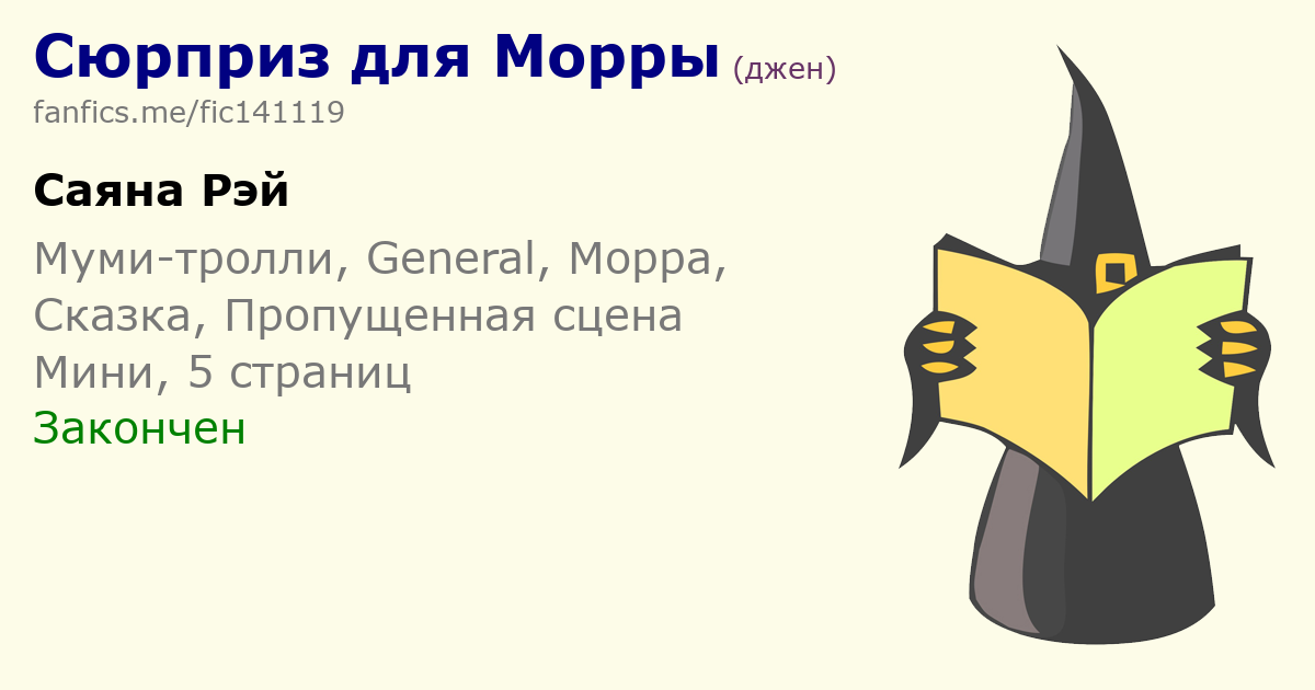 | Stasya R Спасибо большое, что прочитали и оставили отзыв. Морра немножко говорит в "Шляпе Волшебника", буквально пару реплик на судебном заседании. Я решила чуточку расширить её эмоциональный диапазон и словарный запас:) 1 | |