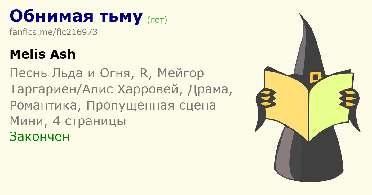 | Анонимный автор Показать полностью Ну шо поделать, разнообразие имен - не сильная сторона мира Мартина, а к женским именам с корнем Алис у него явно что-то личное. Еще в "Доме дракона" одна из главных героинь Алисента, а у её сына любовница Алис. А до этого была королева Алисанна, бгг. Мужские же имена Таргариенов это в принципе квест "как не перепутать кто все эти люди". Например, в "Доме дракона" старшего сына Алисенты, по совместительству претендента на престол, зовут Эйгон, и Эйгоном же зовут одного из сыновей от второго брака другой претендентки на престол. Но такое количество похожих имен в рамках династии в духе эпохи, кмк. Вот с Алис и вариациями - там уже явная личная склонность у автора. О! Вот это интересно. =))) Значит всё это не просто так. Хе-хе. *восхищается владением информации по вселенной* Насколько я помню, орги требовали, чтобы такие моменты прописывались в шапке. Про степень "здоровости" отношений может и лишним было писать, но я решила перестраховаться, потому что писала по конкретной, но не особо подробной заявке, и мне не хотелось ненароком создать ситуацию, где автор заявки ожидает, например, что-то нежно-романтичное, а в тексте ссора влюбленных и мудак Мейгор. (Он, конечно, и в каноне...эээ... очень жестокий человек, как минимум, и закончилось все у пары очень плохо, но это же не значит, что у них с Алис не могло быть светлых моментов в отношениях.) Хмммм. Лучше перебдеть, чем недобдеть?)) Понимаю))) Это я к тому написала, что у вас и описания то не было, а просто факт наличия одним предложением. Хех. Ну шоподелать, я не мастер PWP. Причем чем симпатичнее мне пейринг, тем сложнее в любую эротику про него. Та она и не обязательна))) Да и тут странное понятие у людей о ПВП. По сути... PWP - фанфик, сосредоточенный на сексе и не блещущий сюжетными изысками и развитием характеров персонажей. Честно говоря, даже в категории ПВП таких не было. Все с сюжетом и развитием))) Да все норм. Восприятие у всех разное же. Ну и да, про турнир, наверное, можно было подробнее расписать и закончить или примирением парочки или еще чем-то, но тогда текст был бы в два раза длинее, а меня из-за завалов в реале хватило только на небольшую зарисовку. Изначально там вообще то ли восемь, то ли девять кб было, я еще допиливала. Понимаю! Но я бы про турнир с удовольствием почитала ^^Ну это так... если в будущем появится желание и возможности. | |