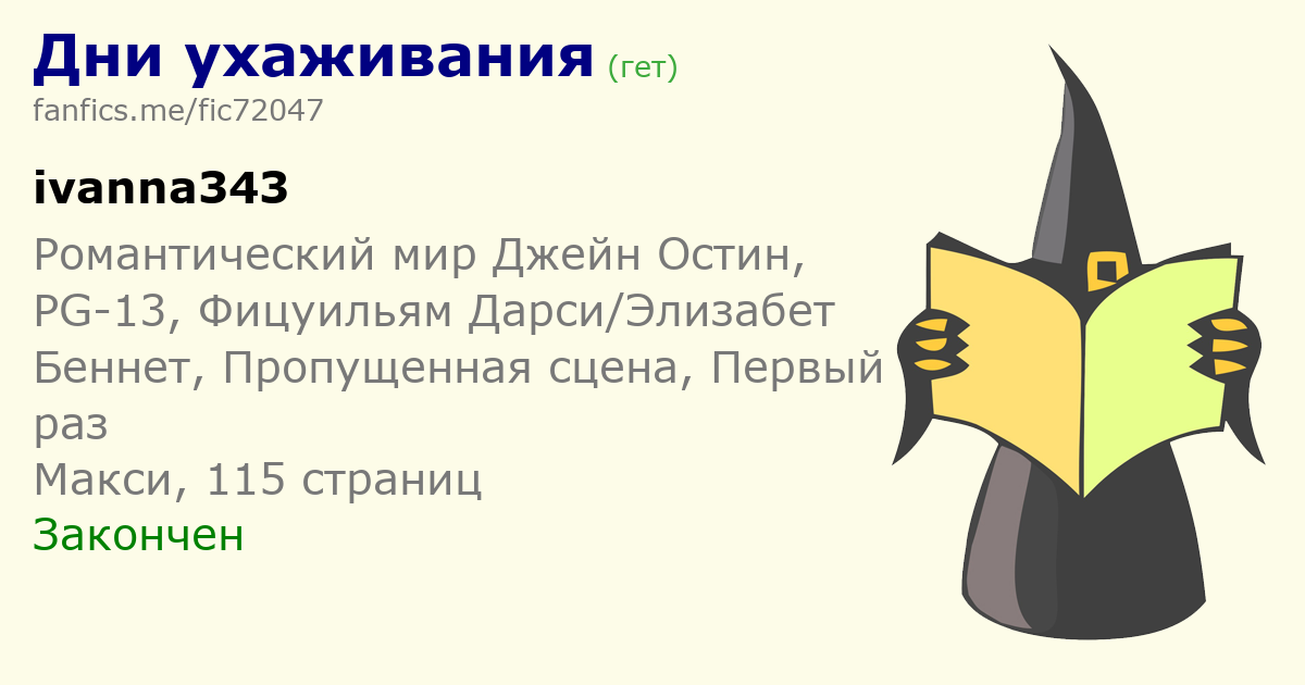 | Любителям, поклонникам и почитателям Джейн Остин и её блистательного романа будет невыразимо приятно прочесть и перечитывать этот фанфик в оригинале и в прекрасном переводе, размещённом здесь. Это по-настоящему проникнутое атмосферой книги продолжение истории, столь же деликатное, сколь органичное. К этому фанфику можно возвращаться не раз и даже непосредственно после прочтения романа. | |